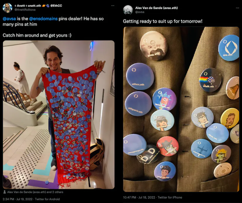 I was not the only one with ENS merch. Our ENS DAO delegate/steward avsa.eth brought tons of ENS badges and placed them everywhere possible, even on his own vest!