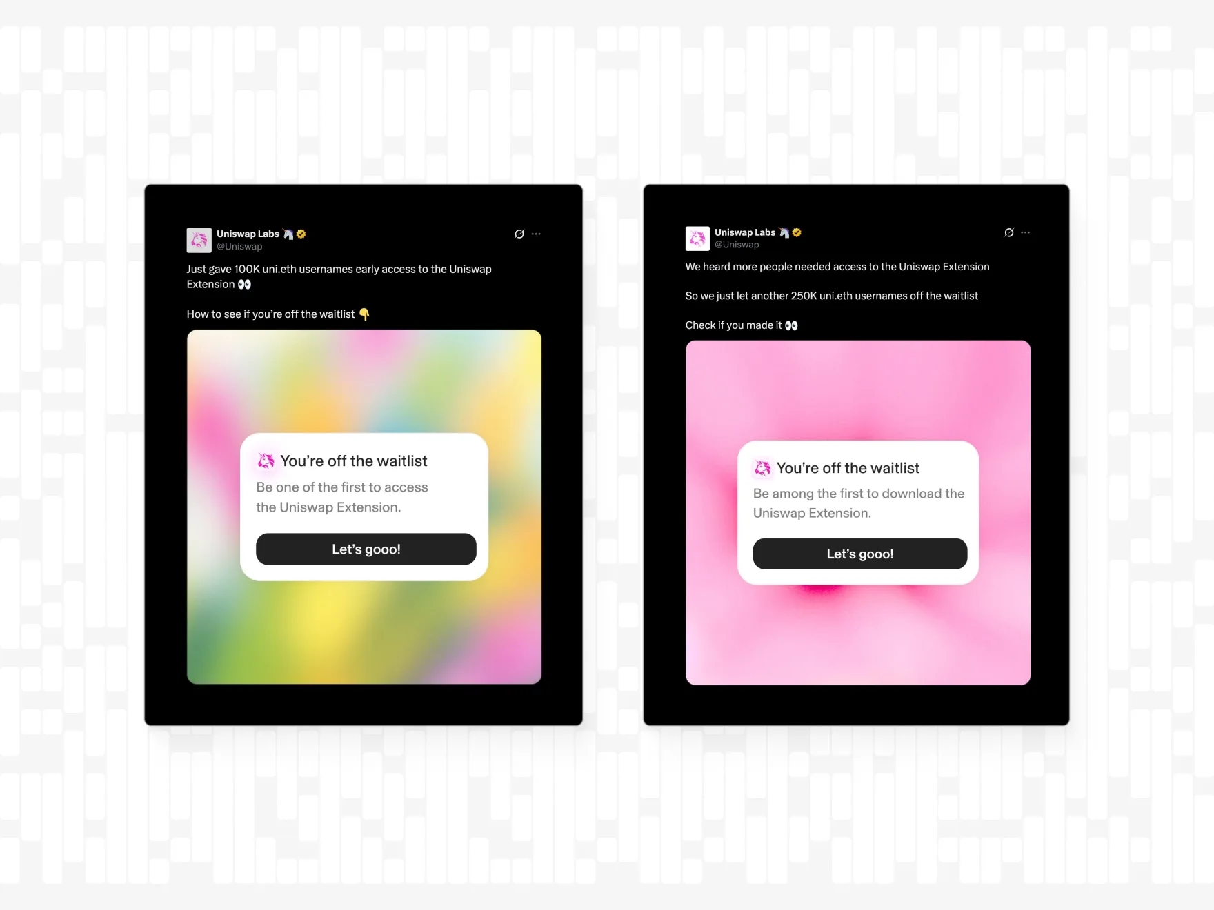 July 6, 2024 - Uniswap Labs granted 100,000 early adopters of Uni.eth usernames access to a waitlisted browser extension